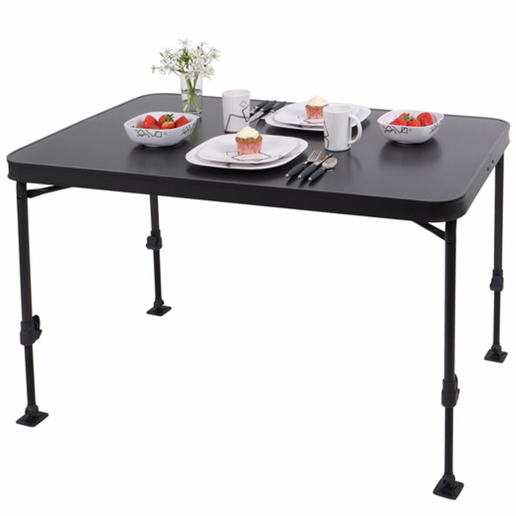 Der Campingtisch PORTO 80 bietet Platz für 2-4 Personen, ideal für Familien. Die Tischplatte besteht aus einer Kombination von Aluminium und Kunststoff in der mittleren Schicht. Dieses Material macht den Tisch nicht nur robust und langlebig, sondern auch leicht und einfach zu transportieren.