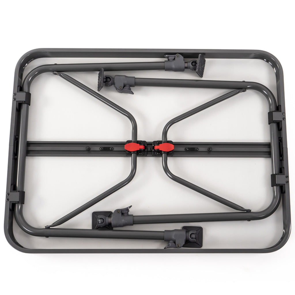 Das Gestell des Tisches ist ebenfalls aus Aluminium gefertigt, was eine hohe Stabilität gewährleistet und gleichzeitig das Gewicht des Tisches niedrig hält. Dadurch ist der PORTO 80 Reisetisch leicht auf- und abzubauen und lässt sich mühelos transportieren.