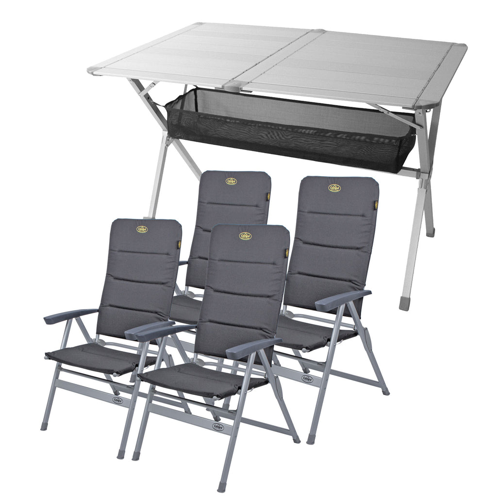 Camping Möbel Komplett Set bestehend aus einem Tisch für bis zu 6 Personen und 4 Camping Stühlen.