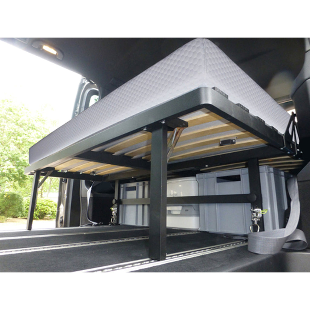 Das bequeme Maxi - Bett mit einer Liegefläche von 195 x 140 cm, wird in den Sitzschienen des Multivan oder California Beach befestigt. Für Transporter und Caravelle gibt es entsprechende Adapter, um das Bett in den Zurrösen zu fixieren. Die Sitze müssen hierfür entnommen werden. Eine 12 cm starke Luxus - Matratze inklusive eines hochwertigen Drell-Bezugs, sorgt für erholsamen Schlafkomfort unterwegs.