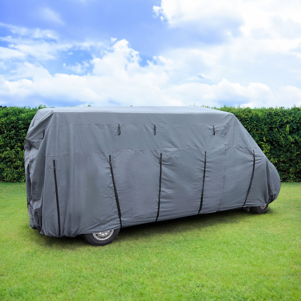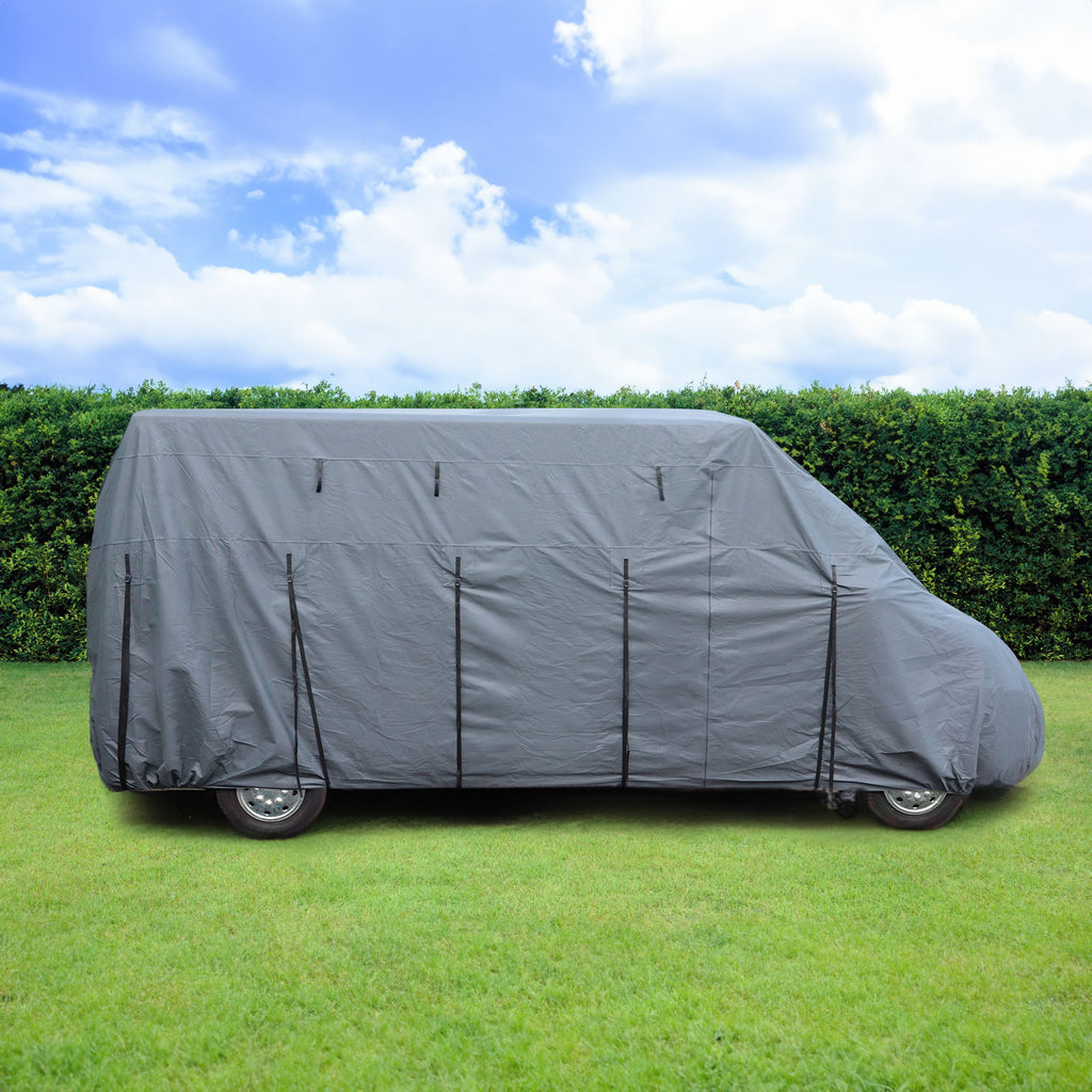 Der ideale Schutz vor Regen, Schnee, Staub, Schmutz und UV-Strahlung. Wohnmobilschutzhülle aus strapazierfähigem SFS-Vliesstoff und atmungsaktivem Gewebe bestehend aus mehreren Lagen. Eingesetzte Verstärkungs-Dreiecke verhindern das Reißen beim straffen Anziehen der Gurte und die seitliche Reißverschlüsse, sorgen für den einfachen Zugang zum Campingbus über die seitliche Schiebetür.
