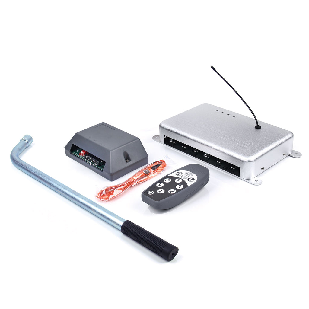 • Lieferumfang: 2x Antriebsmotoren, 1x Verbindungsstange, 1x Fernbedienung, 1x Batterietrennschalter, 1x Bedienungsanleitung