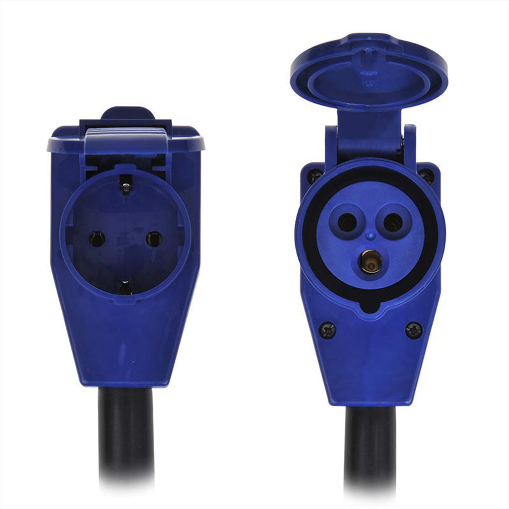 CEE-Verlängerung mit Winkelkupplung zum Anschluss an handelsübliche Steckdosen mit Schutzkappe. Winkelstecker mit rückseitiger Schukosteckdose.