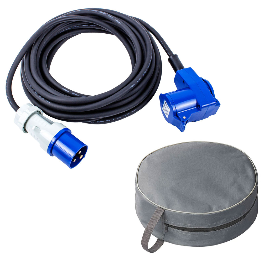 Neopren Verlängerungskabel mit CEE Winkelstecker und zusätzlicher Schukosteckdose inkl. praktischer Aufbewahrungstasche für einen sicheren Transport und Lagerung.