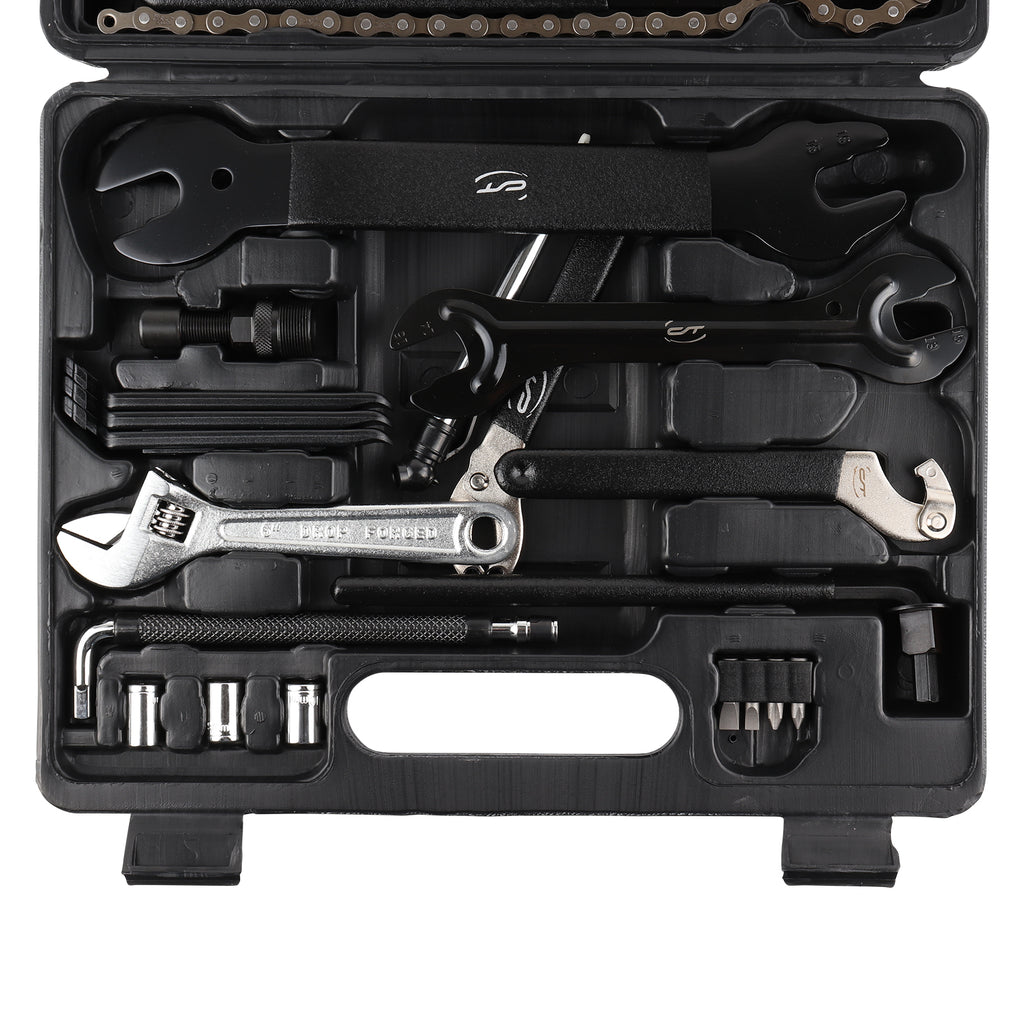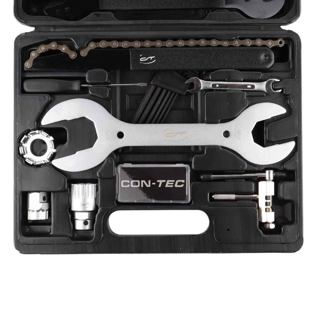 Der handliche Werkzeugkoffer von CONTEC bietet alles, wonach sich Fahrrad-Profis und Hobbyisten sehnen. Das Fahrradwerkzeug besteht aus gehärtetem Stahl und ist für den professionellen Werkstattgebrauch vorgesehen. Ein stoßfester Kunststoffkoffer schützt das Werkzeug vor Beschädigungen und sorgt zudem für Ordnung. So hat alles seinen Platz und ist bei Bedarf griffbereit.