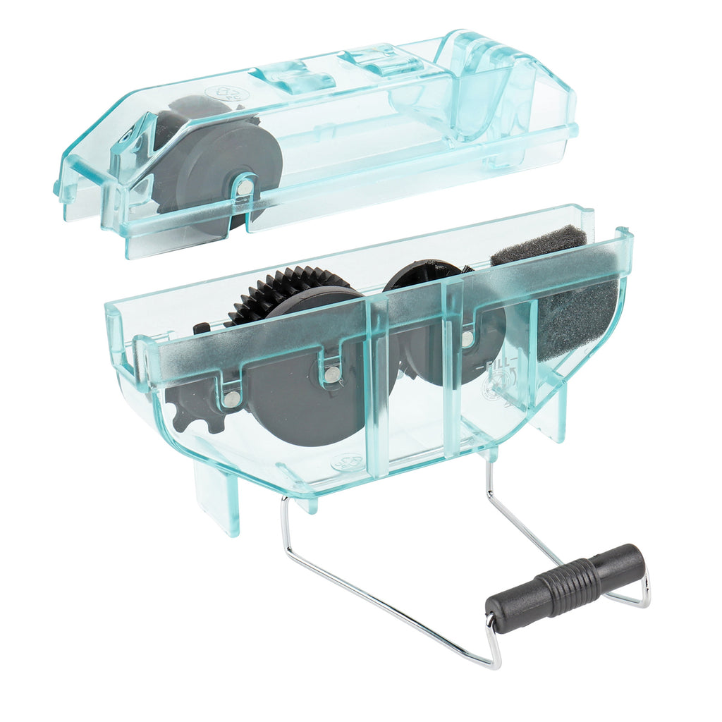 Fahrrad Kettenreinigungsgerät von CONTEC für eine professionelle Reinigung der Fahrradkette. Der Kettenreiniger ist die ideale Ergänzung zu jedem Werkzeugkoffer. Mit vier Bürsten befreit das Gerät jede Fahrradkette vor Verschmutzung und Dreck. Das Gehäuse besteht aus einem transparentem Kunststoff und ist tropffest. Durch den Griff an der Unterseite, lässt sich das Reinigungsgerät leicht einsetzen.>