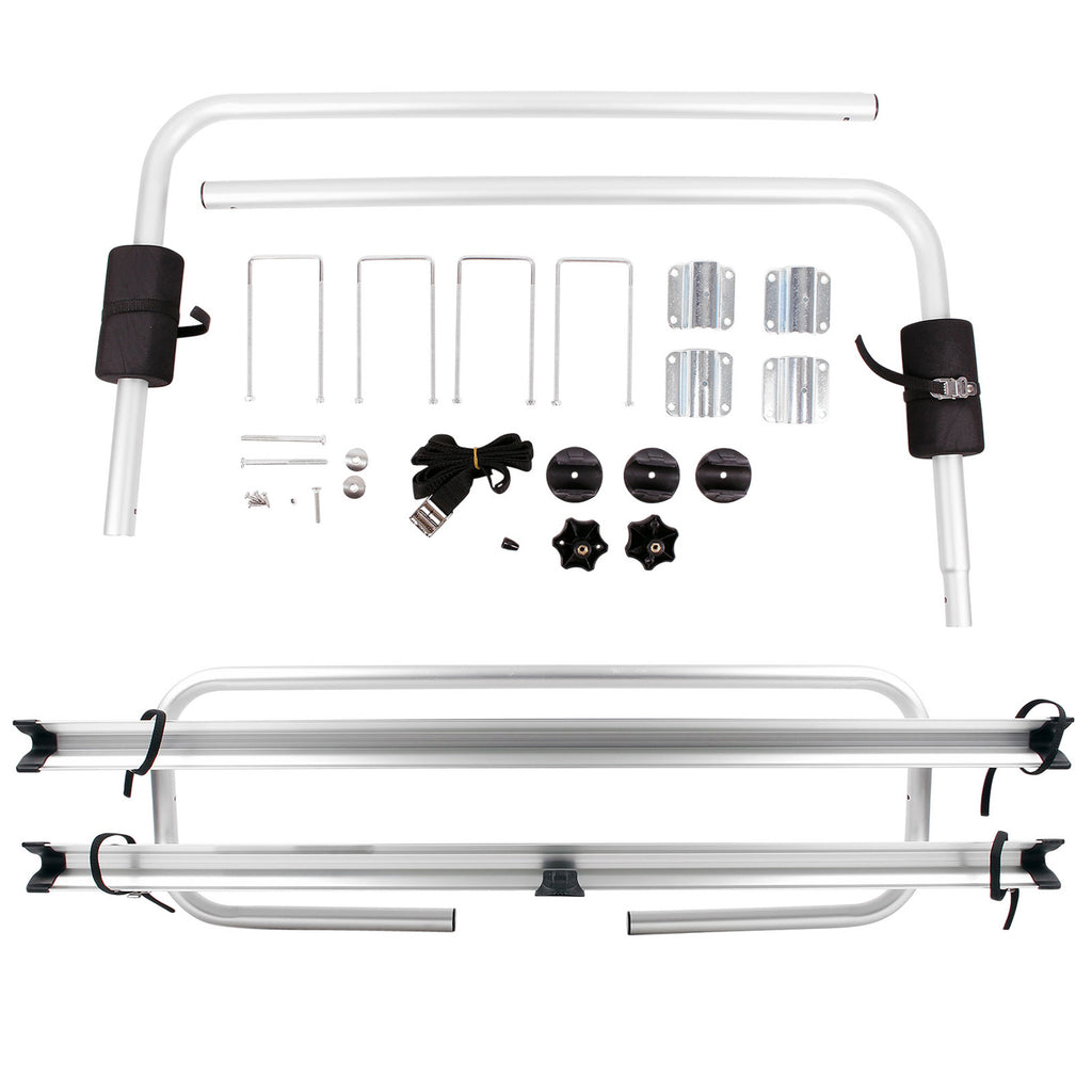 Der Deichsel-Fahrradträger Caravan Eco bietet Platz für zwei Fahrräder, damit Du künftig auch auf dem Campingplatz mobil unterwegs bist. Durch die im Lieferumfang enthaltenen U-Bügel, lässt sich der Camping-Fahrradträger auf fast allen herkömmlichen V-Deichseln befestigen. Befestigungsgurte an Vorder- und Rückseite der Fahrradschienen tragen zu einer sicheren Befestigung der Fahrräder bei. Des Weiteren befinden sich an der Oberseite des Deichsel-Fahrradträgers zwei Schaumstoffpolster, um ein Verkratzen des Fahrradrahmens zu verhindern. Zwei weitere Befestigungsriemen dienen zusätzlich als Absicherung der Räder. So wird bei rauer Fahrweise schlimmeres verhindert. Zudem ist der Deichsel-Fahrradträger mit einer Kippfunktion ausgestattet, um einen Zugang zum Gaskasten sicherzustellen. Die Schiene hat eine Breite von 5 cm und verläuft nach unten hin schmaler bis zu 2 cm. Empfohlene Höchstgeschwindigkeit: 80 km/h.