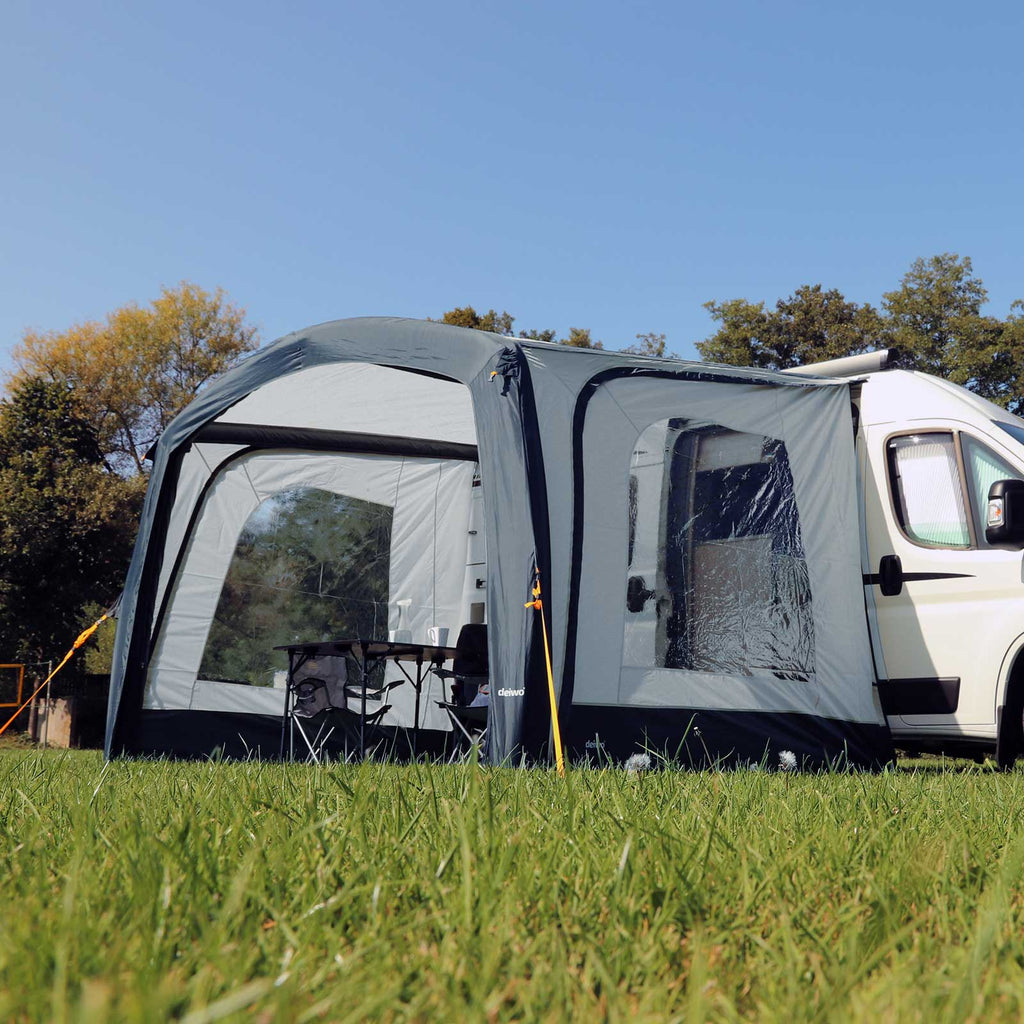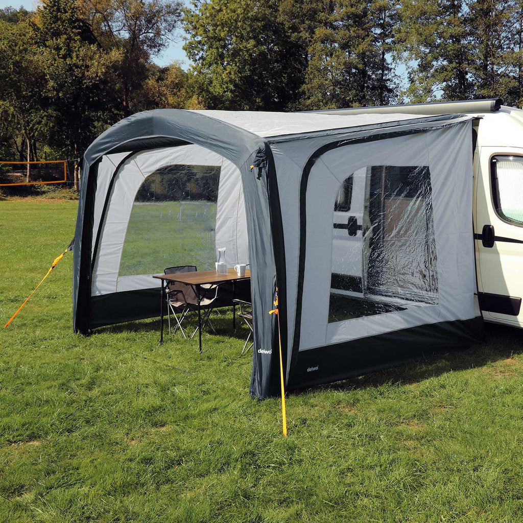 Set bestehend aus zwei Seitenwänden, die für das Luft Vorzeltvordach geeignet sind. Die Seitenwände sind mit großen Fenstern ausgestattet, sodass Sie Ihre tolle Aussicht weiterhin genießen können. Die Seitenwände können genutzt werden, um sich vor Wind oder einem leichten Regenschauer zu schützen. Diese Seitenwände sind passend für die deiwo® Luft Sonnensegel Modelle.