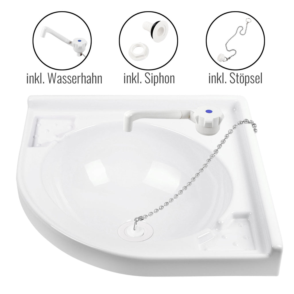 wamovo® Eckwaschbecken im Komplettset mit Ablaufgarnitur und 12V Wasserhahn