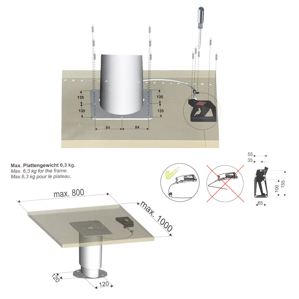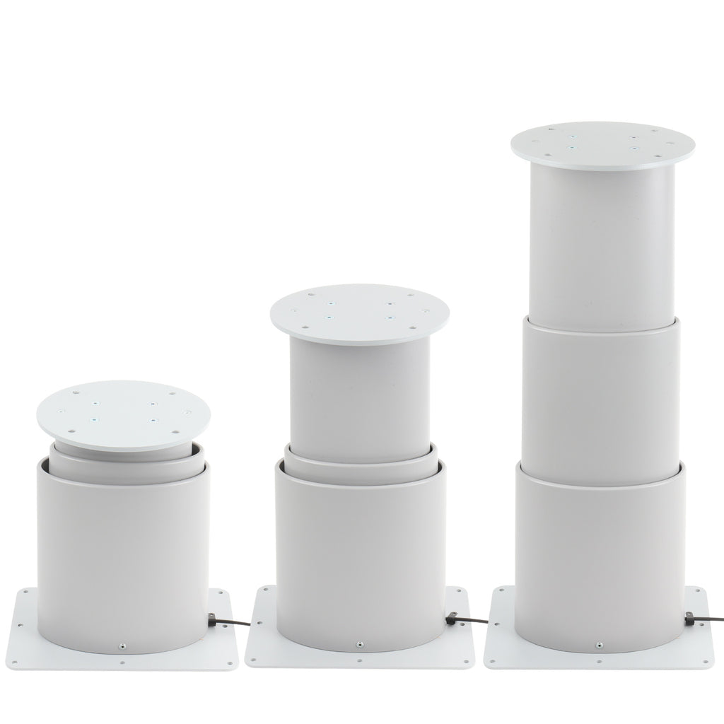 Einsäulen-Hubtischgestell mit stufenloser Höhenverstellung von 310 - 670 mm. Fußteller am Boden aufschraubbar. Gestell mit hochwertiger, robuster Pulverbeschichtung in elegantem Silbergrau.