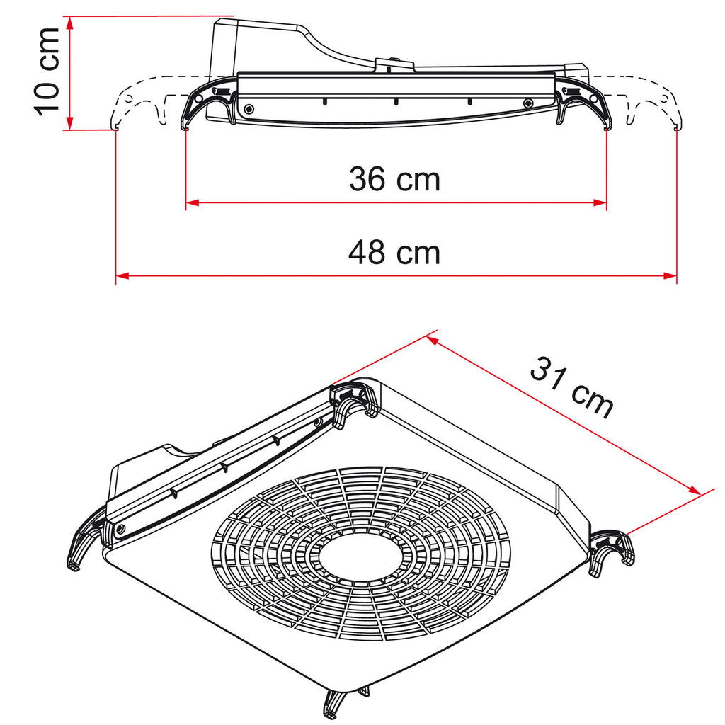 Der Turbo Kit mit dem verstellbaren Klemmsystem ermöglicht das Einhängen ohne grossen Aufwand in fast alle Dachhauben mit den Maßen 40x40 cm bis 50x70 cm. Verwendung nur bei stehendem Fahrzeug, der Kit besteht aus einem Ventilator mit einem Durchmesser von 24 cm und zwei teleskopierbaren Montagewinkeln die von 36 cm bis 48 cm verstellbar sind. Zweistufige Schaltung, durch Umpolen des 12 V Stromkabel kann der Luftstrom geändert werden (Be- und Entlüftung).