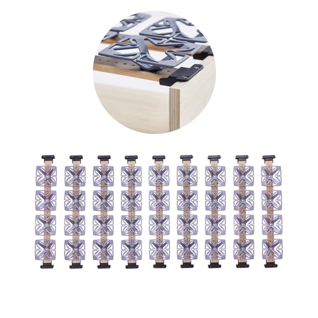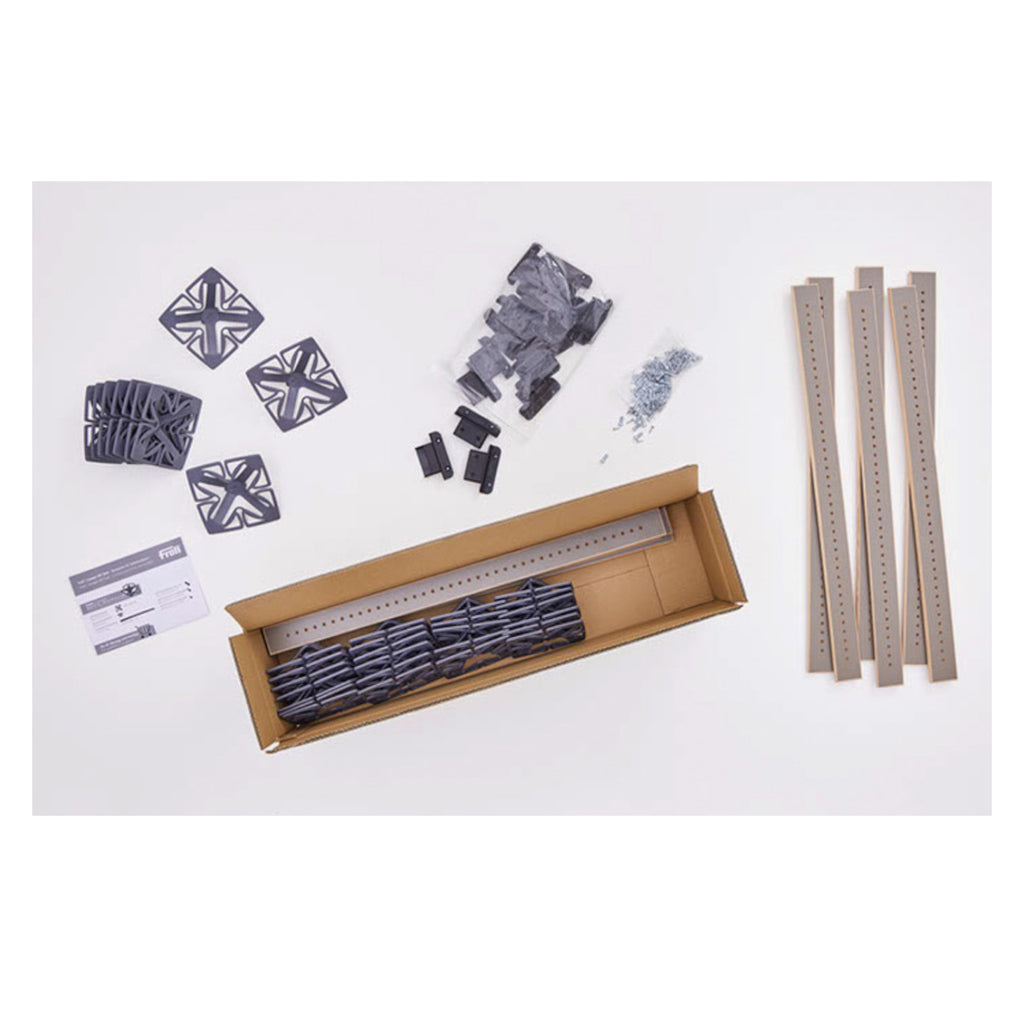 Das DIY-Set beinhaltet elf gebogene Federleisten. Das Lattenrost, bestehend aus einzelnen Federleisten, einfach auf die benötigte Länge zu sägen. Die Löcher, für die Froli Federn, sind auf den Federleisten vorgebohrt. Hier kann variiert werden um das beste Schlafgefühl zu schaffen. Dabei gilt, je mehr Federn verwendet wird, desto fester wird die Liegefläche. Matratze drauflegen und schon ist das Froli-Bett fertig.