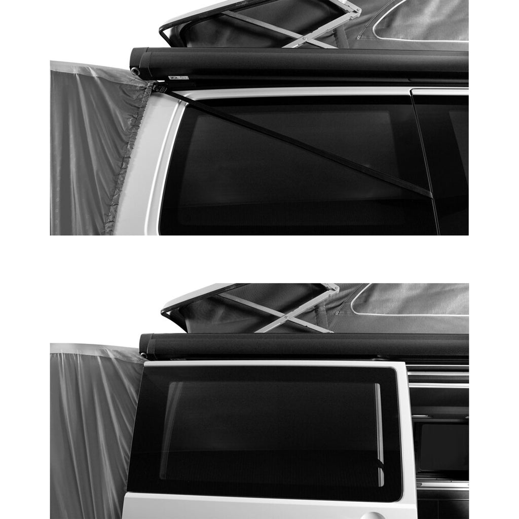 Perfekt für Camping und Kurztrips zum Kochen, als Tagesunterkunft oder Umkleidekabine. Der weitere Raum direkt am Fahrzeug sorg für ein komfortableres Vanlife. Dank des intelligenten Designs kann die Heckklappe sicher geschlossen und verriegelt werden oder die Heckklappe bleibt Nachts geöffnet, während im Van mit dem internen Insektenschutzgitter für eine gute Belüftung gesorgt wird. Mit nur einem Aluminium-Bogen ist das Heckzelt sehr schnell aufgebaut und es hat ein geringes Packmaß. Durch das clevere Befestigungssystem werden Schiebentüren nicht durch Abspannseile blockiert. Im großen Zelteingang ist ein Insektenschutzfenster, welches mit einem wasserdichten Vorhang verschlossen werden kann. Optional kann die Tür als Sonnendach aufgestellt werden (Aufstellstangen nicht im Lieferumfang entfhalten). Das Heckzelt eignet sich ideal für Campingbusse und Transporter wie VW T5, T6, Mercedes Vito und dergleichen.