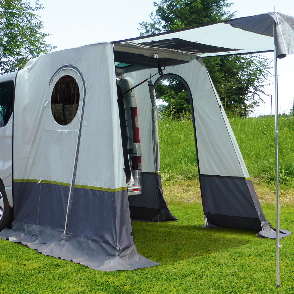 Ideales Heckzelt für Renault Trafic, Ford Transit Custom, Fiat Talento, Opel Vivaro und Nissan NV300. Das Heckzelt, mit besonders großem Innenraum (B/H/T 220 x 210 x 230 cm) , lässt sich ganz ohne Gestänge aufbauen. Lediglich das Zelt über die Heckklappe werfen und mit Zeltheringe am Boden sichern. Aufgebaut bietet der Innenraum genügend Platz für Fahrräder, Campingmöbel oder ein Feldbett. Durch die eingenähten Moskitonetze an den Fenstern sind umherfliegende Insekten kein Problem mehr. Ein weiteres Plus: Die Rückwand ist auch als Sonnensegel verwendbar.