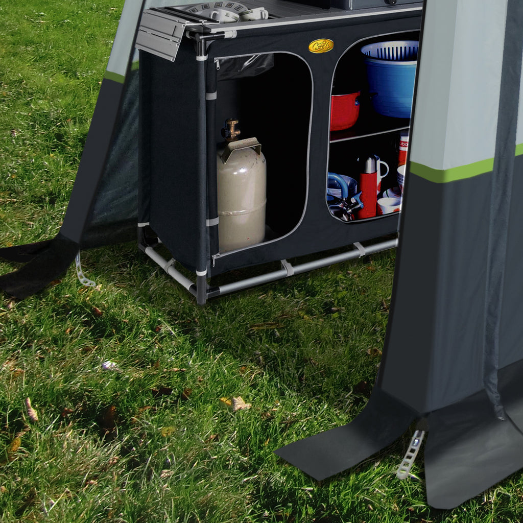 Kein Gestänge, geringes Packmaß und einfacher Aufbau machen das Heckzelt 'Upgrade' zur perfekten Wahl aller Kastenwagenfahrer. Einfach über die Heckklappe stülpen und schon ist Platz für ein Feldbett, Fahrrad oder einfach nur um mehr Frischluft im Fahrzeug zu bekommen. Rückwand als Sonnensegel hochstellbar. Fenster und Eingang in der Seitenwand. Für mehr Licht sorgt das PVC-Fenster im Dach.