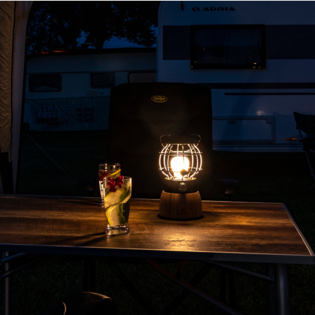 Holiday Travel LED Campinglicht eine Camping Laterne im Retro Sturmlampen Stil, im edlen Materialmix (Bambus, Metall, Kunststoff). Der extra starke Lithium-Akku, kann auch als Powerbank genutzt werden, um andere USB Geräte aufzuladen. Für eine lange Akkulaufzeit, sorgt die Kombination aus Lithium-Akku und Dimmfunktion. Ideal für Camping, Wandern und Angeln.