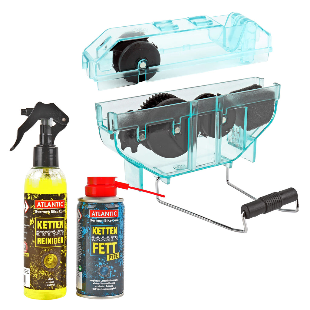Eine saubere Kette ist im Bikesport das A und O. Schmutz, Nässe und Sand können die Lebensdauer einer Fahrradkette extrem verkürzen. Mit dem Kettenpflege-Set wirken sie dem entgegen. Der Kettenreiniger und Kettenreinigungsgerät löst Fett und Dreck effektiv von der Fahrradkette und mit dem im Lieferumfang enthaltenen Kettenfett läuft es wie geschmiert auf der nächsten Tour.