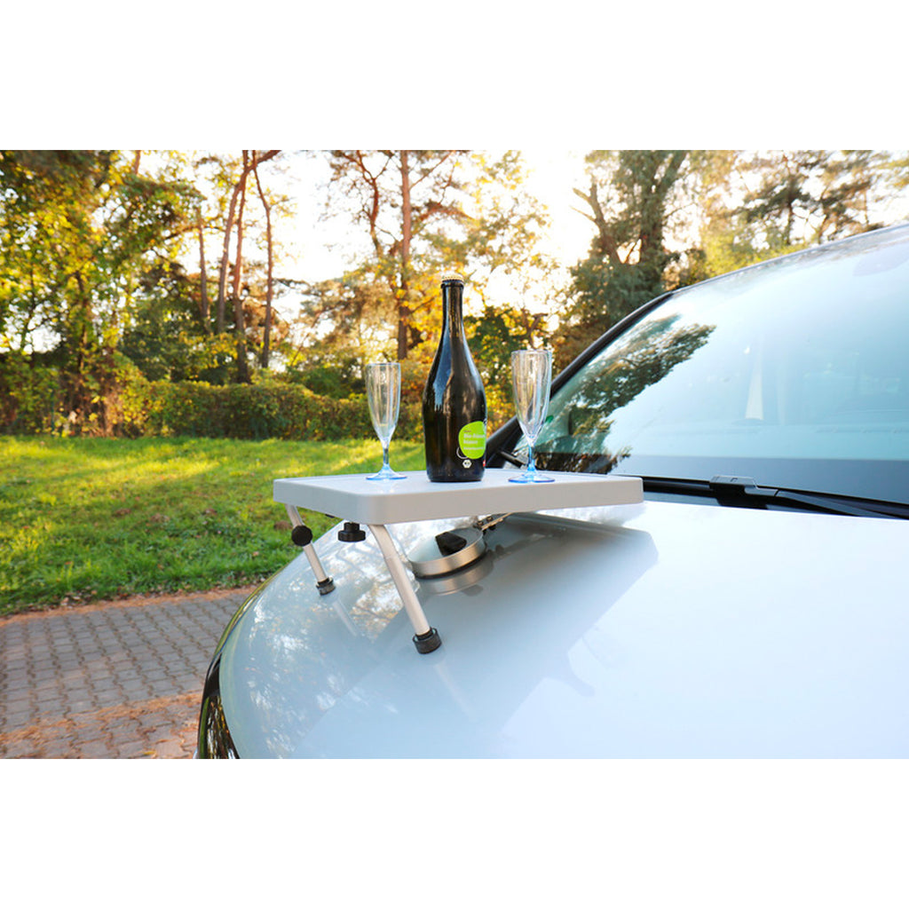 Ergänze dein Camping - Möbel Sortiment um einen Motorhaubentisch Multifix mit Klappsaugerbefestigung. Passend ist dieser für die meisten Basisfahrzeuge. Mittels starkem Saughalter wird der Tisch auf der Motorhaube befestigt und über die höhenverstellbaren Beine in eine gerade Position gebracht und fixiert. Ideal zum abstellen für die Satelitenschüssel, Kaffeebar, Getränkebar, Schreibunterlage im Außendienst, Ablage für jegliche Gegenstände, Auflage für den Fotoapparat und vieles mehr. Der Motorhaubentisch ist faltbar und kann somit bei Nichtnutzung, platzsparend verstaut werden.