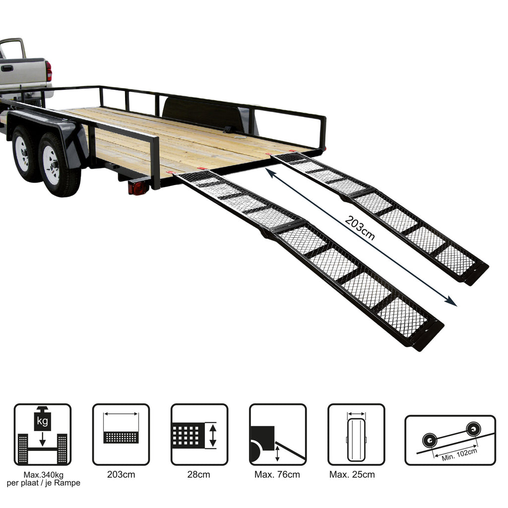 Extra starke Auffahrrampe aus Stahl, universal einsetzbar für alle Motorräder. Mit einer max. Belastung von 340 Kg ist diese Motorradrampe auch für schwerere Modelle geeigent. Durch die Klappfunktion lässt sich die Rampe leicht verstauen. Der Transport wird durch Handgriffe erleichtert. Die Oberseite ist mit einer Stahlgitter Beplakung. Dies ist optimal für zb. Motocrosser, da der Schmutz leicht abgeführt wird.