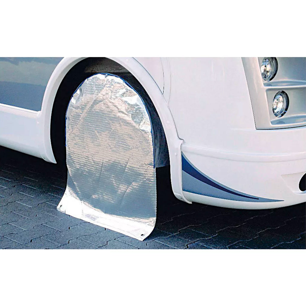 Die sonnenlichtreflektierende Radabdeckung "Reflex" ist der ideale Schutz von Wohnwagen- oder Wohnmobilreifen vor Alterung und Beschädigung durch längere Einwirkung von Sonnen- und UV-Strahlen und ist speziell für Freitzeitfahrzeuge konzipiert.