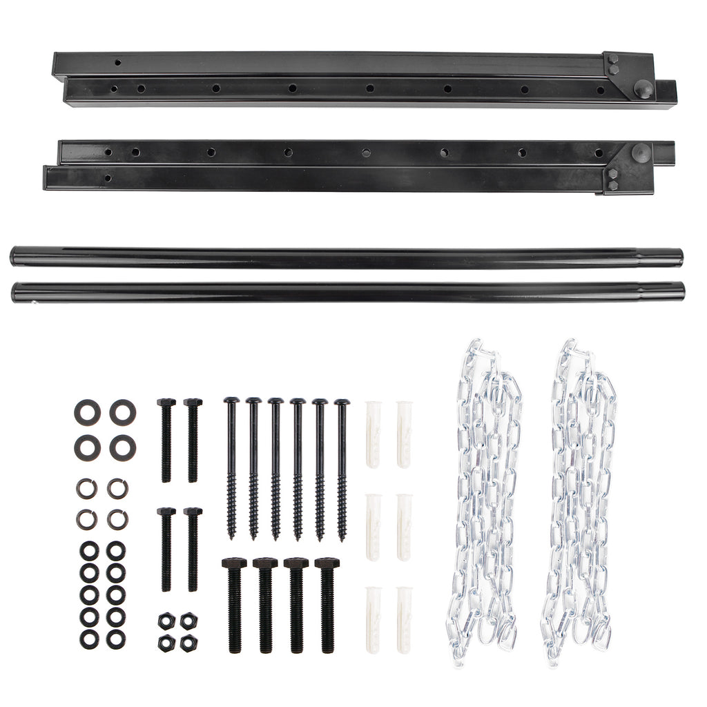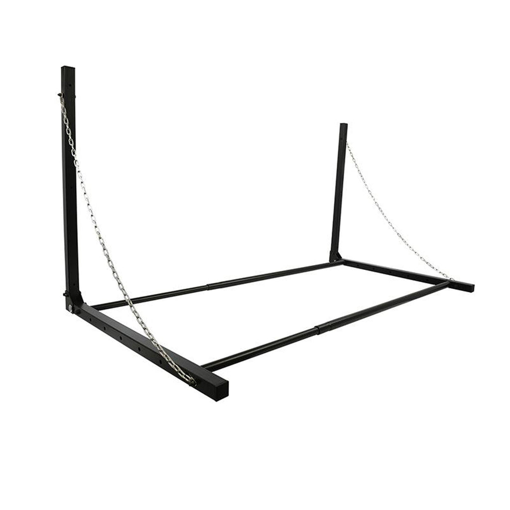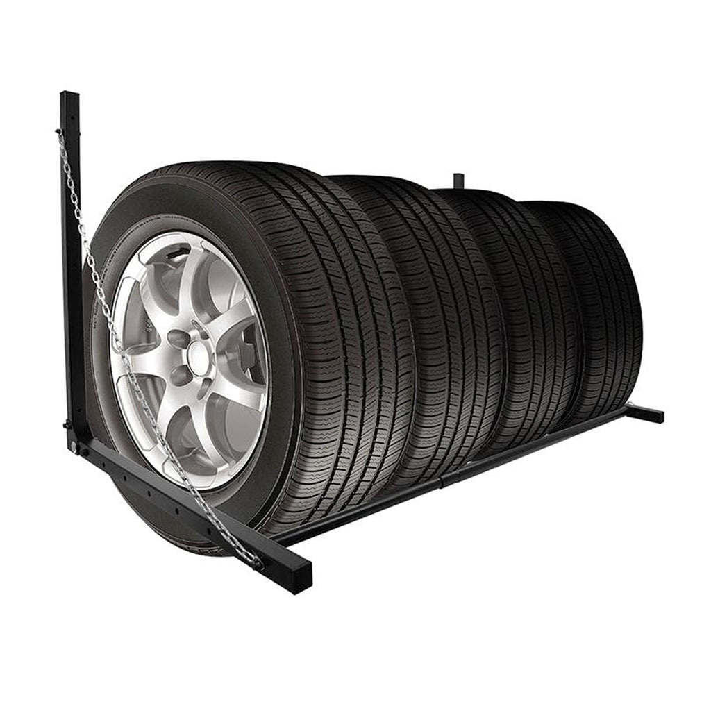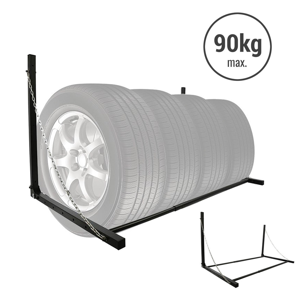 Reifen Wandhalter aus pulverbeschichtetem Stahl, zur Aufbewahrung von Auto- und Motorradreifen. Das Reifenregal ist in der Breite verstellbar (90 - 130 cm) und lässt sich platzsparend nach oben klappen. Eine Sicherungskette, an beiden Seiten des Reifenregals, verhindert ein Herabstürzen der Reifen. Das Sechspunkte-Befestigungssystem kann an jeder Garagenwand befestigt werden und hält einer Maximallast von 90 kg stand.
