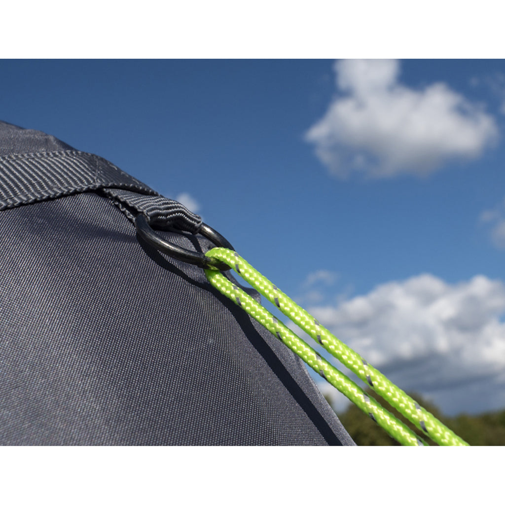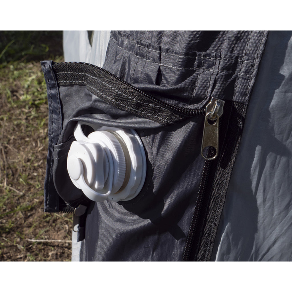 Eine aufrollbare Tür in einer Seitenwand mit Reißverschluss ermöglicht einen bequemen Zugang, während du im Dach praktische Haken für eine Lampe vorfindest. Das Lampenkabel lässt sich geschickt in der Luftschlauchhülle verlegen, um für eine angenehme Beleuchtung zu sorgen.