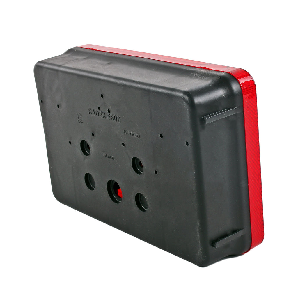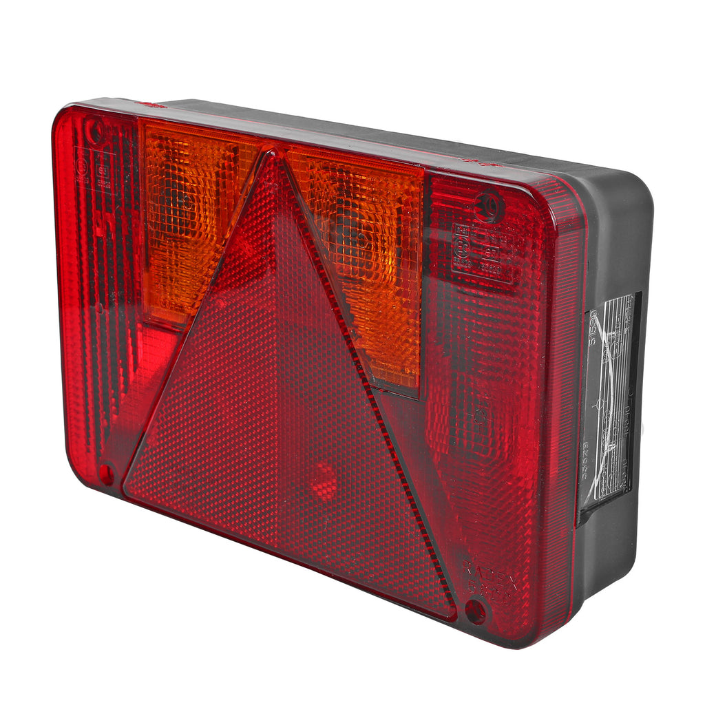 Klassische Anhänger 6-Kammerleuchte mit Schlusslicht, Bremslicht, Blinker, Nebelschlussleuchte, Kennzeichenleuchte und integriertem Dreiecksrückstrahler. Mit den Maßen von (B/H/T) 21,5 x 14,0 x 5,5 cm passt die Anhängerschlussleuchte an fast alle gängigen Anhängermarken. Die Rückseite der Anhängerleuchte besteht aus einem robusten Kunststoff mit vier Montagelöchern und einer Bohrung für die Stromversorgung.