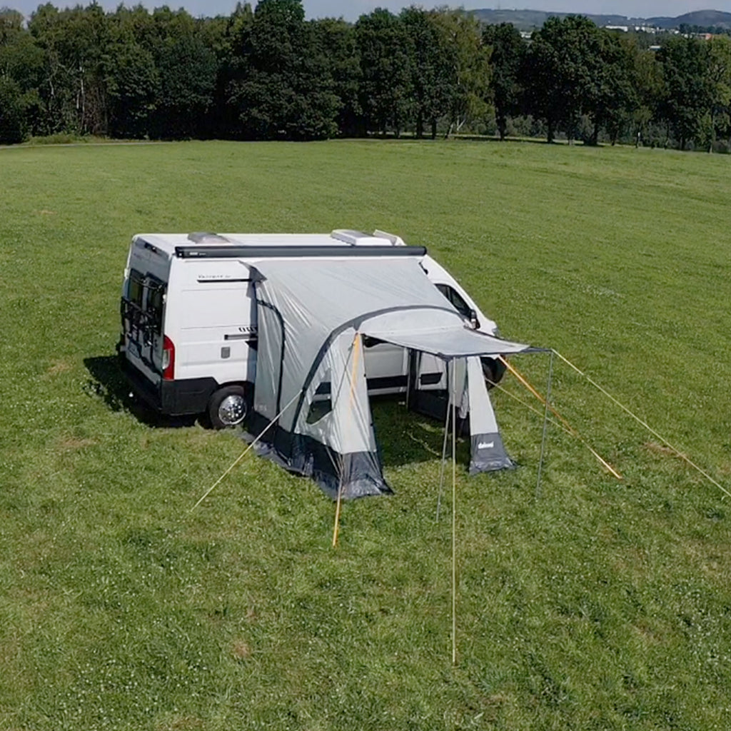 Das Luft-Vorzelt eignet sich optimal für Wohnwagen, Wohnmobile und Caravans und bereichert deinen nächste Camping-Urlaub. Mit nur einem Luftschlauch ist das Vorzelt schnell und einfach auf- & abgebaut. Für eine optimale Belüftung, sind beide Seitentüren sowie die große Fronttür mit Moskitonetzen ausgestattet. Transparente Fenstern befinden sich ebenfalls seitlich und an der Fronttür. Die Front kann zudem komplett geöffnet werden und dank Aufstellstangen zu einem Sonnensegel errichtet werden.
