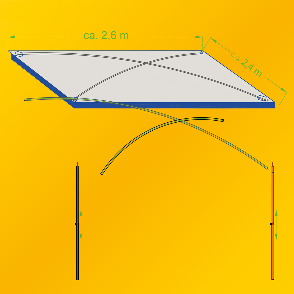 • Lieferumfang: Sonnendach, 2 Aufstellstäbe Stahl, 2 Diagonalstäbe aus Glasfaser, Erdnägel und Abspannleinen