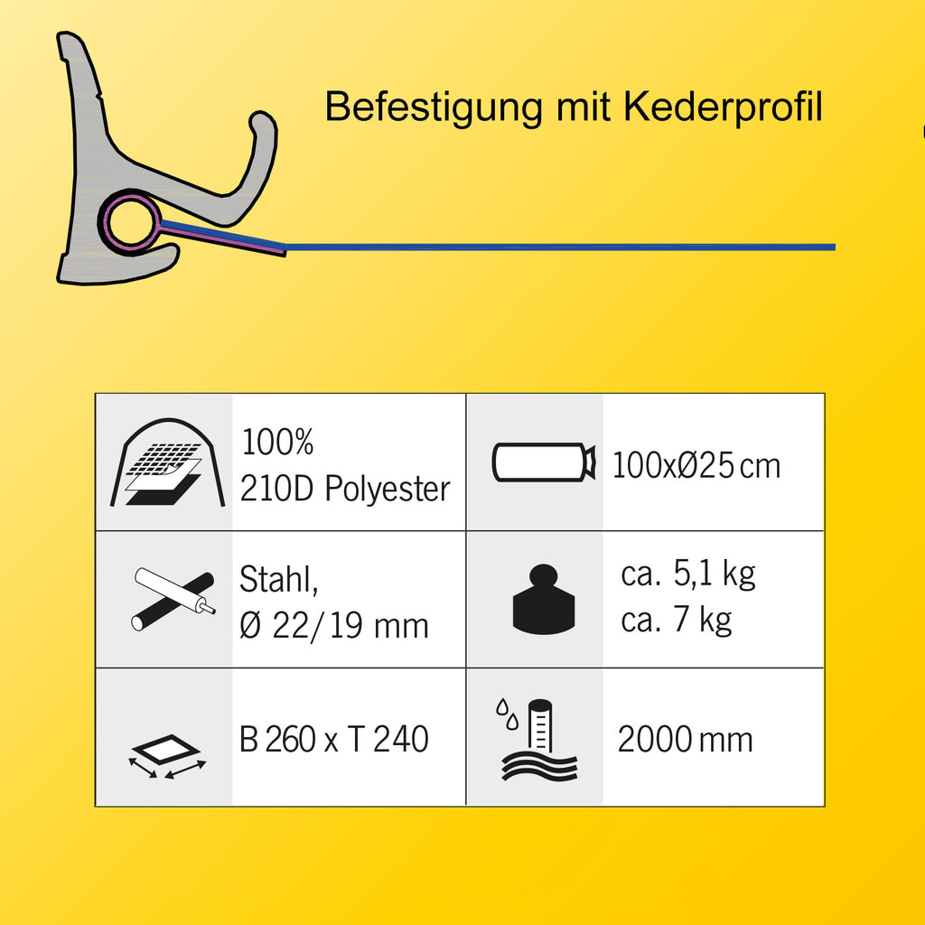 Anschluss ans Fahrzeug mit dem angenähten Kederprofil, passend für Multirail und VW T5 California Kederschiene. Lieferung mit zwei Aufstellstäben sowie zwei diagonal verlaufenden Glasfaserstäbe, die das Sonnendach nach oben durchwölben.