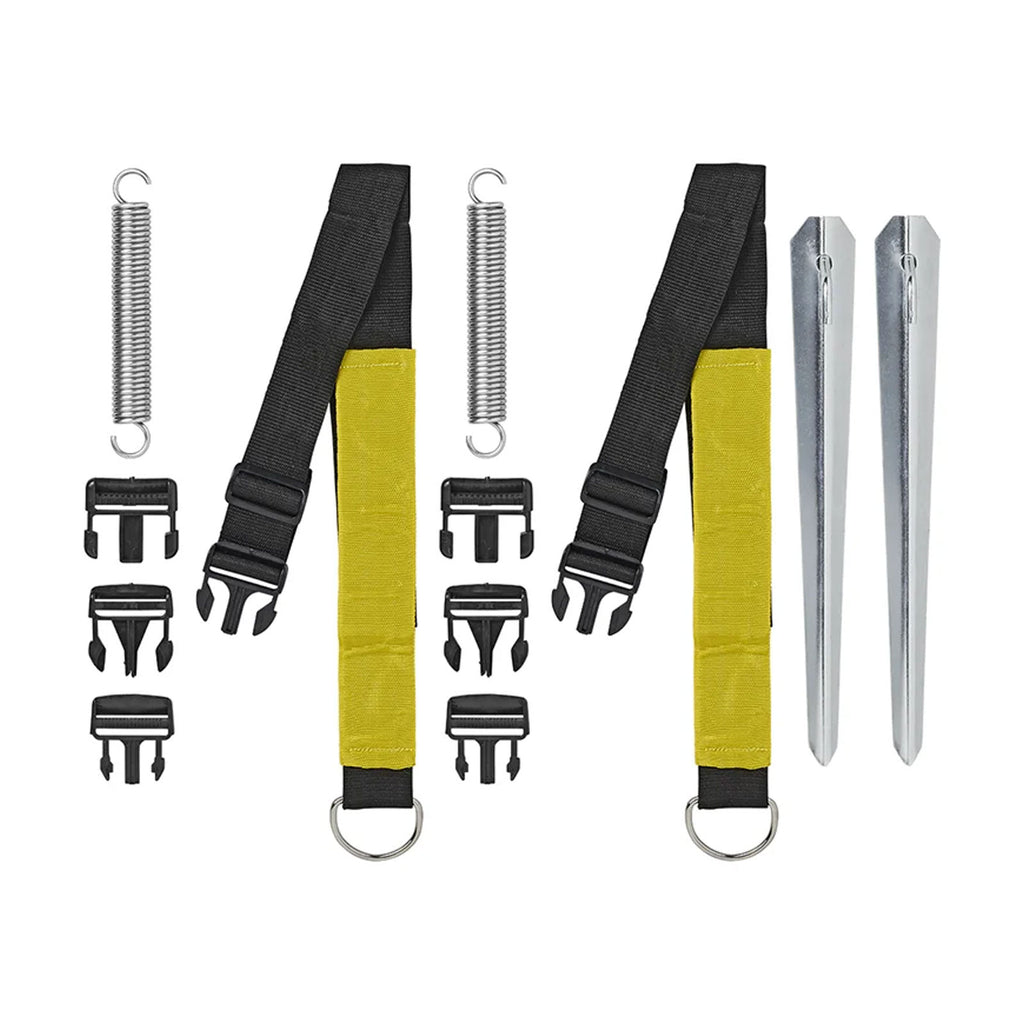 Sturmband-Set mit verschiedenen Schnellverschlüssen zur Befestigung an den Eckclips der Markise oder Vorzelte. Die Gurte, aus einem hoch strapazierfähigem Nylongewebe sorgen für mehr Stabilität und die Spannfedern beugen Reiß- und Zugkräfte durch Windböen aus. So halt die Markise auch bei Wind und Wetter den ultimativen Halt und Sturmschäden werden begrenzt.