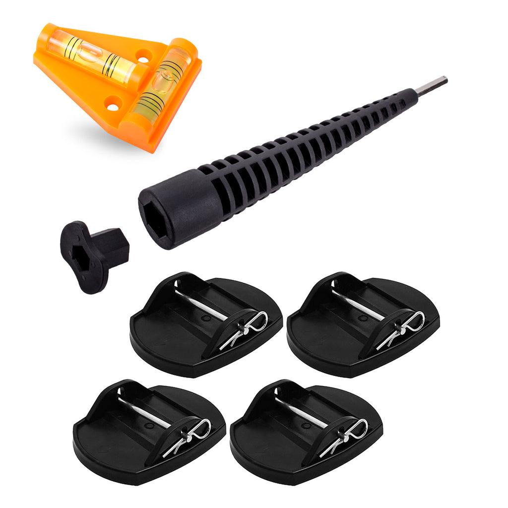 • Das Set beinhaltet 4 Stützplatten inkl. Arretierbolzen (Metall)