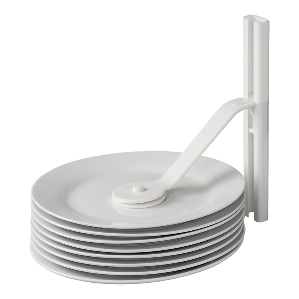 Geschirrhalter für Wohnwagen und Wohnmobil, stufenlos einstellbar. Der Tellerhalter wird durch einen Klebestreifen an der Regal-Rückwand befestigt. Der individuell verstellbare Fuß mit Anti-Rutsch-Auflage kann an die Tellerhöhe angepasst werden.