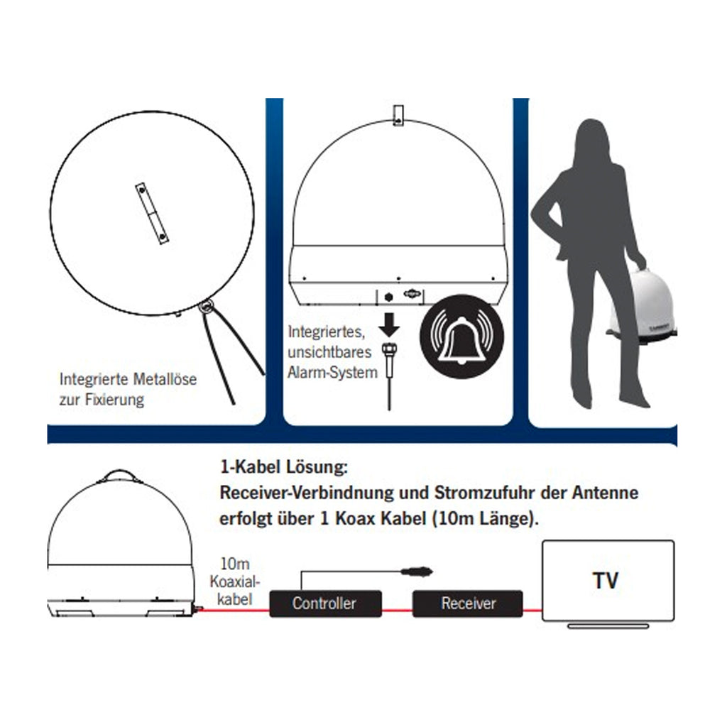 Die robuste Kunststoffhaube schützt bestmöglich gegen Witterungseinflüsse. Der Tragegriff erleichtert den Transport. 1-Kabel-Anschluss: Verbindung der Antenne mit dem Controller inkl. Stromübertragung über Koaxialkabel (10m). Metallöse zur Befestigung eines Stahlkabels gegen Diebstahl. Zudem akustisches Warnsignal bei nicht erlaubter Entfernung des Koaxialkabels.