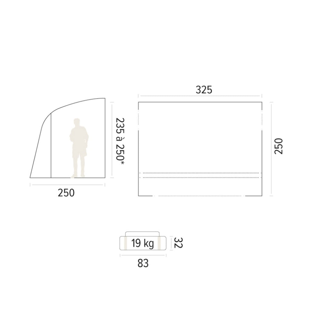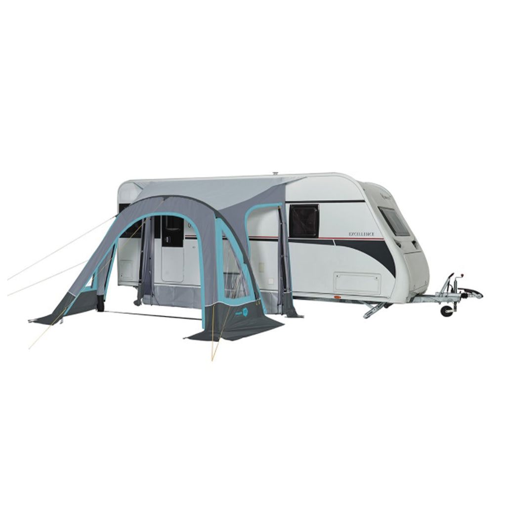 Profitiere von der Air Camp-Technologie, einer TRIGANO-Innovation, die die Installation vereinfacht und das Volumen erheblich reduziert. Dadurch ist das aufblasbare Vorzelt sehr einfach aufzubauen und bereichert deinen nächste Camping-Urlaub. Der geschaffene Wohnraum bietet idealen Platz zum Essen, Spielen oder Entspannen und bietet ausreichend Schutz vor Wettereinflüssen. Die Front ist abnehmbar und kann zur Vergrößerung der Wohnfläche aufgerollt werden. Die beiden Seitentüren mit Moskitonetzen sorgen für eine gute Belüftung und Luftzirkulation im Zelt. Um die Privatsphäre zu gewährleisten, wurden vor den Fenstern Verdunkelungsrollos installiert. Mit der Option Blind Kit kann das Vorzelt an die Jalousien bestimmter Reisemobile und Vans angepasst werden.