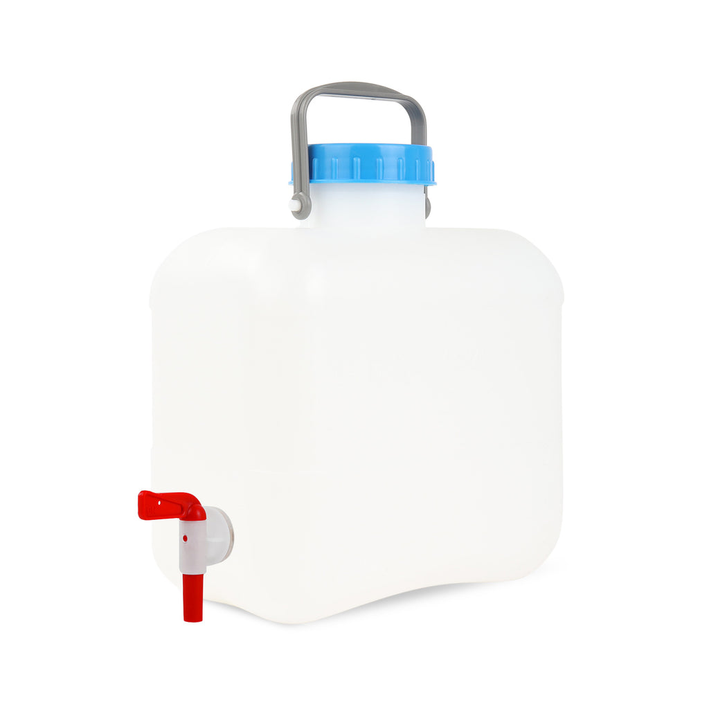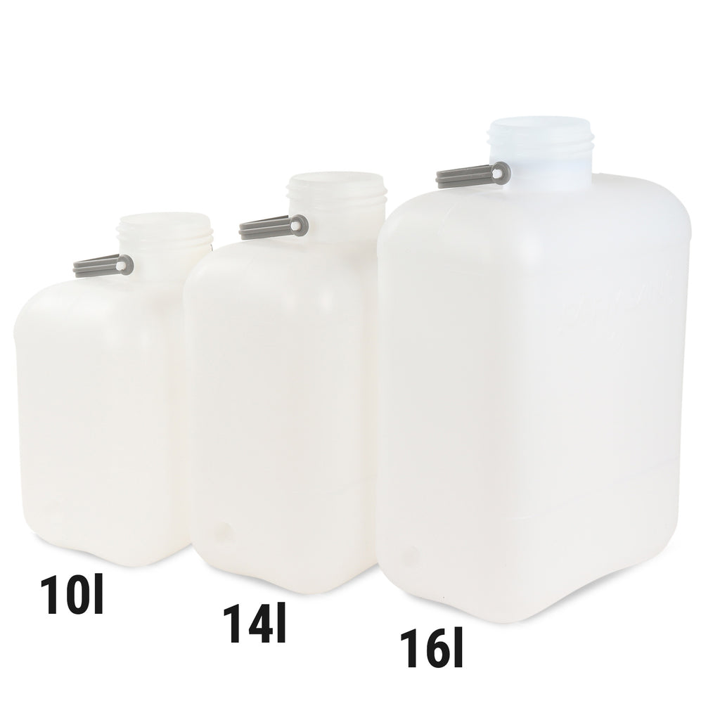 Der Weithalskanister von Wamovo lässt sich durch die große Öffnung einfach befüllen. Ausgestattet mit Stopfen zur Festinstallation oder Verwendung eines Wasserhahns.