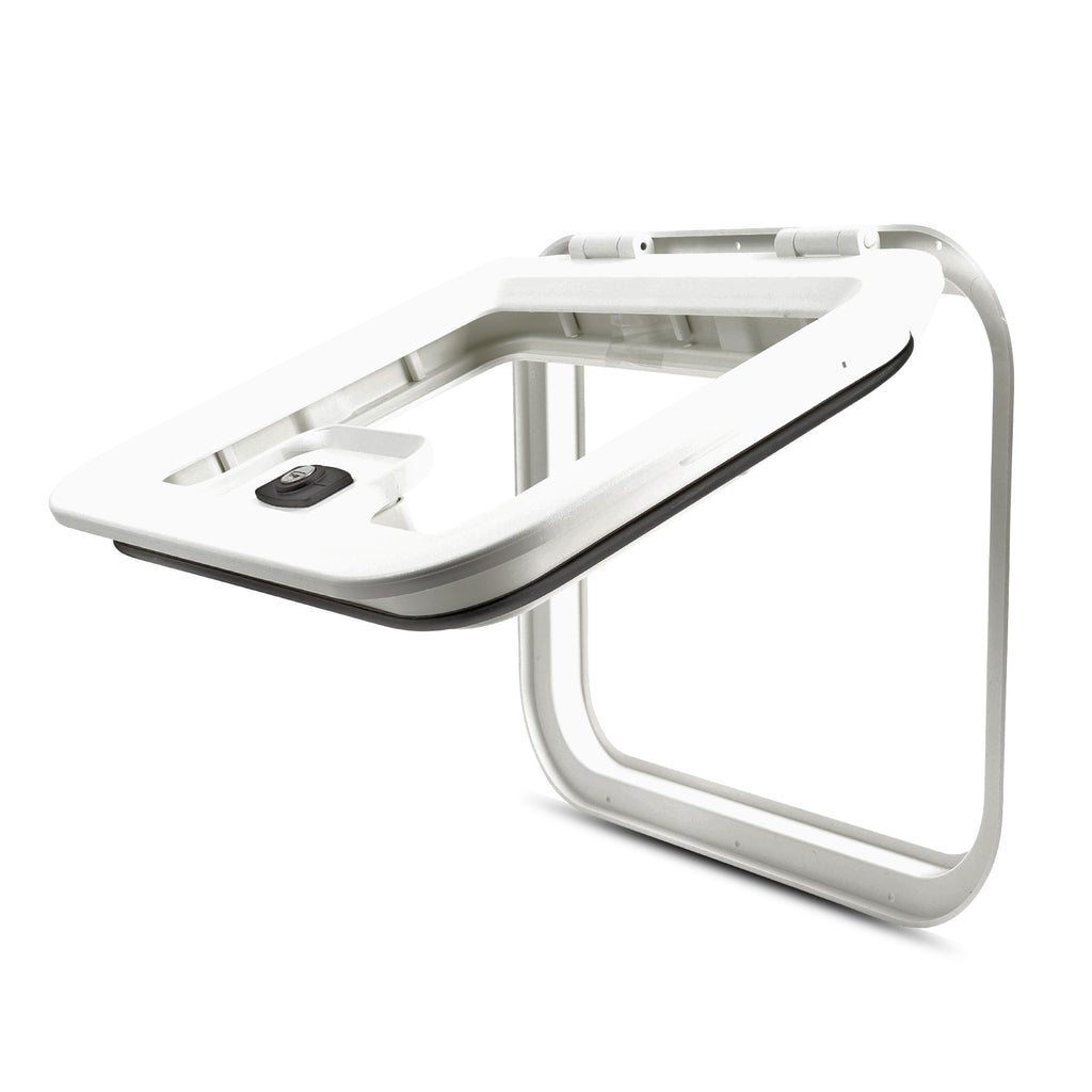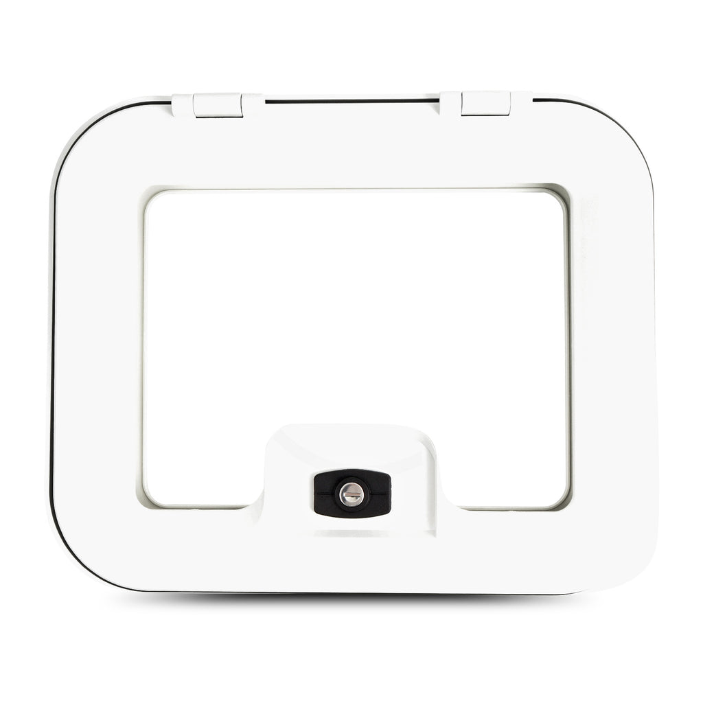 Universell passende Stauchfachklappe für Ihren Wohnwagen, Wohnmobil oder Campingbus. Das optisches Erscheinungsbild Ihres Fahrzeuges bleibt erhalten, da das ausgeschnittene Blech in den Klappenrahmen eingesetzt wird. Der innere Kunststoffrahmen schafft einen schönen Übergang zum Innenraum. Ein stabiles Schloß mit 2 Schlüsseln sorgt für Sicherheit. Für alle Wandstärken. Zum Ausschnittmaß bitte 2 cm für den Rahmen zusätzlich einkalkulieren. Die Serviceluke besteht aus hochwertigem und leichtem Kunststoff und ist daher sehr langlebig.