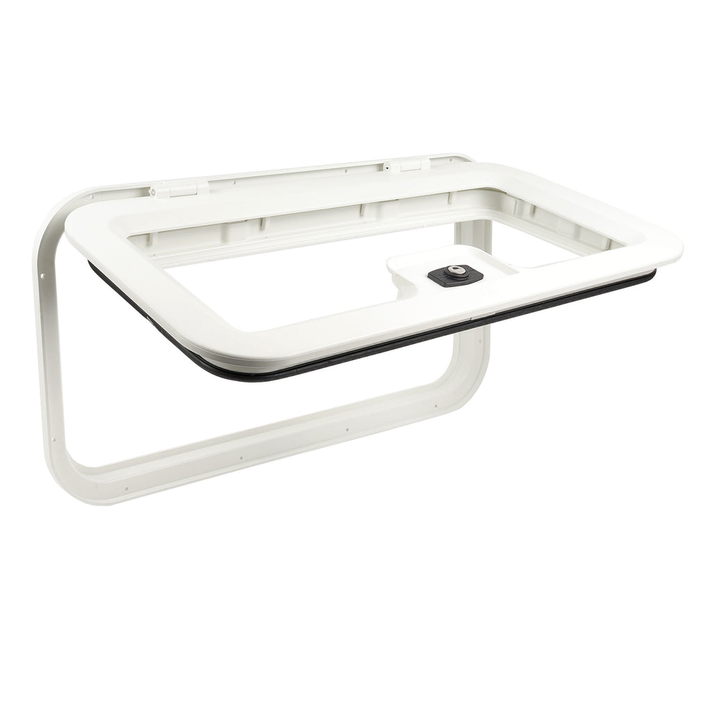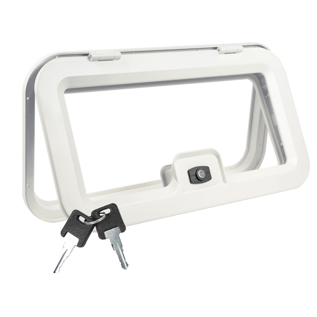 Universell passende Stauchfachklappe für Ihren Wohnwagen, Wohnmobil oder Campingbus. Das optisches Erscheinungsbild Ihres Fahrzeuges bleibt erhalten, da das ausgeschnittene Blech in den Klappenrahmen eingesetzt wird. Der innere Kunststoffrahmen schafft einen schönen Übergang zum Innenraum. Ein stabiles Schloß mit 2 Schlüsseln sorgt für Sicherheit. Für alle Wandstärken. Zum Ausschnittmaß bitte 2 cm für den Rahmen zusätzlich einkalkulieren. Die Serviceluke besteht aus hochwertigem und leichtem Kunststoff und ist daher sehr langlebig.